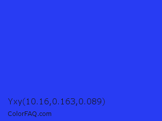 Yxy 10.16,0.163,0.089 Color is a normal blue color and the nearest color is Palatinate Blue #273be2. Hex code #283cf3 and RGB value is rgb(40,60,243). In RGB color space, this color is composed of 16% red, 24% green, 95% blue, In CMYK color space, this color is composed of 84% cyan, 75% magenta, 0% yellow , 5% black , In HSL color space, this color has a hue angle of 234° , 89% saturation and 55% lightness.