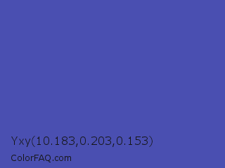 Yxy 10.183,0.203,0.153 Color is a normal blue color and the nearest color is Ocean Blue #4f42b5. Hex code #4a4fb1 and RGB value is rgb(74,79,177). In RGB color space, this color is composed of 29% red, 31% green, 69% blue, In CMYK color space, this color is composed of 58% cyan, 55% magenta, 0% yellow , 31% black , In HSL color space, this color has a hue angle of 237° , 41% saturation and 49% lightness.