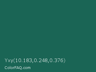 Yxy 10.183,0.248,0.376 Color is a dark cyan color and the nearest color is Eden #105852. Hex code #1a6555 and RGB value is rgb(26,101,85). In RGB color space, this color is composed of 10% red, 40% green, 33% blue, In CMYK color space, this color is composed of 74% cyan, 0% magenta, 16% yellow , 60% black , In HSL color space, this color has a hue angle of 167° , 59% saturation and 25% lightness.
