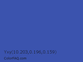 Yxy 10.203,0.196,0.159 Color is a normal blue color and the nearest color is Violet Blue #324ab2. Hex code #3b53ae and RGB value is rgb(59,83,174). In RGB color space, this color is composed of 23% red, 33% green, 68% blue, In CMYK color space, this color is composed of 66% cyan, 52% magenta, 0% yellow , 32% black , In HSL color space, this color has a hue angle of 227° , 49% saturation and 46% lightness.
