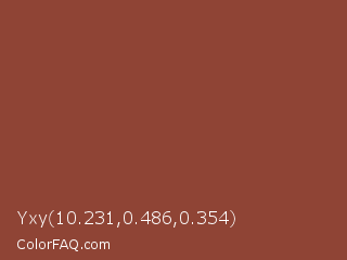 Yxy 10.231,0.486,0.354 Color is a normal red color and the nearest color is Chestnut #954535. Hex code #8f4435 and RGB value is rgb(143,68,53). In RGB color space, this color is composed of 56% red, 27% green, 21% blue, In CMYK color space, this color is composed of 0% cyan, 52% magenta, 63% yellow , 44% black , In HSL color space, this color has a hue angle of 10° , 46% saturation and 38% lightness.