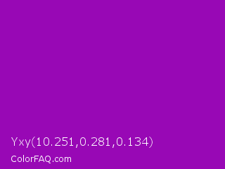Yxy 10.251,0.281,0.134 Color is a normal purple color and the nearest color is Purple Munsell #9f00c5. Hex code #9808b5 and RGB value is rgb(152,8,181). In RGB color space, this color is composed of 60% red, 3% green, 71% blue, In CMYK color space, this color is composed of 16% cyan, 96% magenta, 0% yellow , 29% black , In HSL color space, this color has a hue angle of 290° , 92% saturation and 37% lightness.