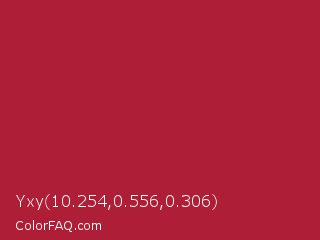 Yxy 10.254,0.556,0.306 Color is a normal red color and the nearest color is Deep Carmine #a9203e. Hex code #ae1f37 and RGB value is rgb(174,31,55). In RGB color space, this color is composed of 68% red, 12% green, 22% blue, In CMYK color space, this color is composed of 0% cyan, 82% magenta, 68% yellow , 32% black , In HSL color space, this color has a hue angle of 350° , 70% saturation and 40% lightness.