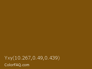 Yxy 10.267,0.49,0.439 Color is a dark orange color and the nearest color is Rusty Nail #86560a. Hex code #7d510a and RGB value is rgb(125,81,10). In RGB color space, this color is composed of 49% red, 32% green, 4% blue, In CMYK color space, this color is composed of 0% cyan, 35% magenta, 92% yellow , 51% black , In HSL color space, this color has a hue angle of 37° , 85% saturation and 26% lightness.