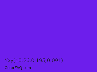 Yxy 10.26,0.195,0.091 Color is a normal violet color and the nearest color is Han Purple #5218fa. Hex code #6d1eec and RGB value is rgb(109,30,236). In RGB color space, this color is composed of 43% red, 12% green, 93% blue, In CMYK color space, this color is composed of 54% cyan, 87% magenta, 0% yellow , 7% black , In HSL color space, this color has a hue angle of 263° , 84% saturation and 52% lightness.