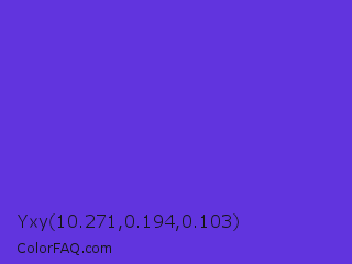 Yxy 10.271,0.194,0.103 Color is a normal indigo color and the nearest color is Majorelle Blue #6050dc. Hex code #6134de and RGB value is rgb(97,52,222). In RGB color space, this color is composed of 38% red, 20% green, 87% blue, In CMYK color space, this color is composed of 56% cyan, 77% magenta, 0% yellow , 13% black , In HSL color space, this color has a hue angle of 256° , 72% saturation and 54% lightness.