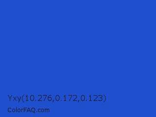Yxy 10.276,0.172,0.123 Color is a normal blue color and the nearest color is New Car #214fc6. Hex code #1f4fcd and RGB value is rgb(31,79,205). In RGB color space, this color is composed of 12% red, 31% green, 80% blue, In CMYK color space, this color is composed of 85% cyan, 61% magenta, 0% yellow , 20% black , In HSL color space, this color has a hue angle of 223° , 74% saturation and 46% lightness.