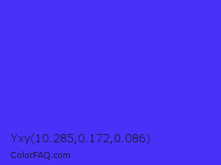 Yxy 10.285,0.172,0.086 Color is a normal indigo color and the nearest color is Han Purple #5218fa. Hex code #4931f7 and RGB value is rgb(73,49,247). In RGB color space, this color is composed of 29% red, 19% green, 97% blue, In CMYK color space, this color is composed of 70% cyan, 80% magenta, 0% yellow , 3% black , In HSL color space, this color has a hue angle of 247° , 93% saturation and 58% lightness.