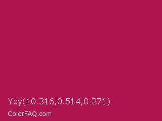 Yxy 10.316,0.514,0.271 Color is a normal rose color and the nearest color is French Wine #ac1e44. Hex code #b0154e and RGB value is rgb(176,21,78). In RGB color space, this color is composed of 69% red, 8% green, 31% blue, In CMYK color space, this color is composed of 0% cyan, 88% magenta, 56% yellow , 31% black , In HSL color space, this color has a hue angle of 338° , 79% saturation and 39% lightness.