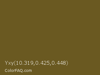Yxy 10.319,0.425,0.448 Color is a dark yellow color and the nearest color is Field Drab #6c541e. Hex code #6a5921 and RGB value is rgb(106,89,33). In RGB color space, this color is composed of 42% red, 35% green, 13% blue, In CMYK color space, this color is composed of 0% cyan, 16% magenta, 69% yellow , 58% black , In HSL color space, this color has a hue angle of 46° , 53% saturation and 27% lightness.