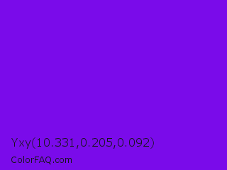 Yxy 10.331,0.205,0.092 Color is a normal violet color and the nearest color is Violet Color Wheel #7f00ff. Hex code #7a0bea and RGB value is rgb(122,11,234). In RGB color space, this color is composed of 48% red, 4% green, 92% blue, In CMYK color space, this color is composed of 48% cyan, 95% magenta, 0% yellow , 8% black , In HSL color space, this color has a hue angle of 270° , 91% saturation and 48% lightness.
