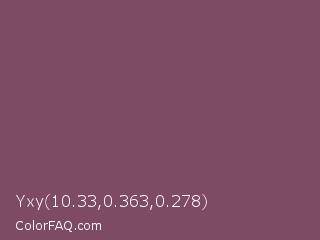 Yxy 10.33,0.363,0.278 Color is a normal rose color and the nearest color is Cannon Pink #894367. Hex code #7f4a64 and RGB value is rgb(127,74,100). In RGB color space, this color is composed of 50% red, 29% green, 39% blue, In CMYK color space, this color is composed of 0% cyan, 42% magenta, 21% yellow , 50% black , In HSL color space, this color has a hue angle of 331° , 26% saturation and 39% lightness.