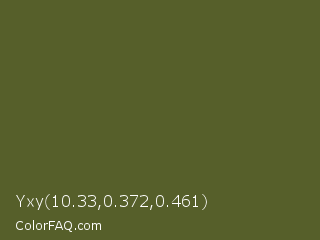 Yxy 10.33,0.372,0.461 Color is a dark yellow color and the nearest color is Costa Del Sol #615d30. Hex code #565f2a and RGB value is rgb(86,95,42). In RGB color space, this color is composed of 34% red, 37% green, 16% blue, In CMYK color space, this color is composed of 9% cyan, 0% magenta, 56% yellow , 63% black , In HSL color space, this color has a hue angle of 70° , 39% saturation and 27% lightness.