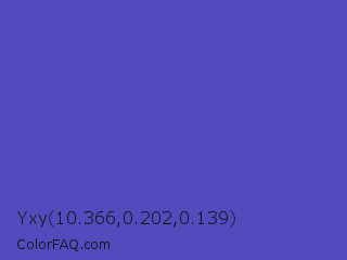 Yxy 10.366,0.202,0.139 Color is a normal indigo color and the nearest color is Ocean Blue #4f42b5. Hex code #524abd and RGB value is rgb(82,74,189). In RGB color space, this color is composed of 32% red, 29% green, 74% blue, In CMYK color space, this color is composed of 57% cyan, 61% magenta, 0% yellow , 26% black , In HSL color space, this color has a hue angle of 244° , 47% saturation and 52% lightness.