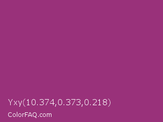 Yxy 10.374,0.373,0.218 Color is a normal magenta color and the nearest color is Maximum Red Purple #a63a79. Hex code #99317a and RGB value is rgb(153,49,122). In RGB color space, this color is composed of 60% red, 19% green, 48% blue, In CMYK color space, this color is composed of 0% cyan, 68% magenta, 20% yellow , 40% black , In HSL color space, this color has a hue angle of 318° , 51% saturation and 40% lightness.