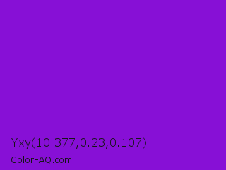 Yxy 10.377,0.23,0.107 Color is a normal purple color and the nearest color is French Violet #8806ce. Hex code #8710d6 and RGB value is rgb(135,16,214). In RGB color space, this color is composed of 53% red, 6% green, 84% blue, In CMYK color space, this color is composed of 37% cyan, 93% magenta, 0% yellow , 16% black , In HSL color space, this color has a hue angle of 276° , 86% saturation and 45% lightness.