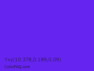 Yxy 10.378,0.189,0.09 Color is a normal indigo color and the nearest color is Han Purple #5218fa. Hex code #6624f0 and RGB value is rgb(102,36,240). In RGB color space, this color is composed of 40% red, 14% green, 94% blue, In CMYK color space, this color is composed of 58% cyan, 85% magenta, 0% yellow , 6% black , In HSL color space, this color has a hue angle of 259° , 87% saturation and 54% lightness.