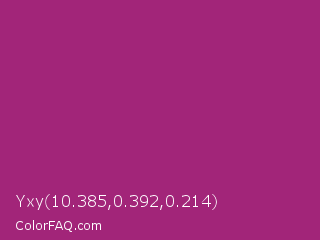 Yxy 10.385,0.392,0.214 Color is a normal magenta color and the nearest color is Amaranth Deep Purple #9f2b68. Hex code #a22579 and RGB value is rgb(162,37,121). In RGB color space, this color is composed of 64% red, 15% green, 47% blue, In CMYK color space, this color is composed of 0% cyan, 77% magenta, 25% yellow , 36% black , In HSL color space, this color has a hue angle of 320° , 63% saturation and 39% lightness.
