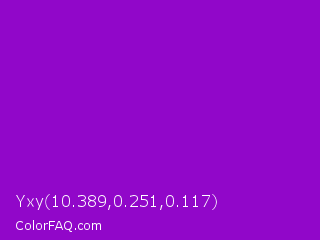 Yxy 10.389,0.251,0.117 Color is a normal purple color and the nearest color is French Violet #8806ce. Hex code #9107c9 and RGB value is rgb(145,7,201). In RGB color space, this color is composed of 57% red, 3% green, 79% blue, In CMYK color space, this color is composed of 28% cyan, 97% magenta, 0% yellow , 21% black , In HSL color space, this color has a hue angle of 283° , 93% saturation and 41% lightness.