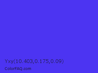 Yxy 10.403,0.175,0.09 Color is a normal indigo color and the nearest color is Han Purple #5218fa. Hex code #4c34f2 and RGB value is rgb(76,52,242). In RGB color space, this color is composed of 30% red, 20% green, 95% blue, In CMYK color space, this color is composed of 69% cyan, 79% magenta, 0% yellow , 5% black , In HSL color space, this color has a hue angle of 248° , 88% saturation and 58% lightness.