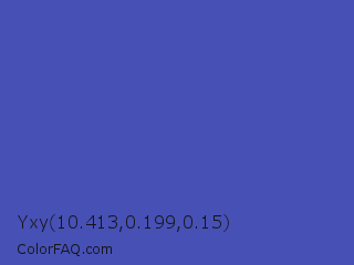 Yxy 10.413,0.199,0.15 Color is a normal blue color and the nearest color is Ocean Blue #4f42b5. Hex code #4750b5 and RGB value is rgb(71,80,181). In RGB color space, this color is composed of 28% red, 31% green, 71% blue, In CMYK color space, this color is composed of 61% cyan, 56% magenta, 0% yellow , 29% black , In HSL color space, this color has a hue angle of 235° , 44% saturation and 49% lightness.