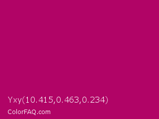 Yxy 10.415,0.463,0.234 Color is a normal magenta color and the nearest color is Lipstick #ab0563. Hex code #b10466 and RGB value is rgb(177,4,102). In RGB color space, this color is composed of 69% red, 2% green, 40% blue, In CMYK color space, this color is composed of 0% cyan, 98% magenta, 42% yellow , 31% black , In HSL color space, this color has a hue angle of 326° , 96% saturation and 35% lightness.