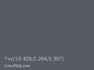 Yxy 10.429,0.294,0.307 Color is a normal blue color and the nearest color is Scarpa Flow #585562. Hex code #575b64 and RGB value is rgb(87,91,100). In RGB color space, this color is composed of 34% red, 36% green, 39% blue, In CMYK color space, this color is composed of 13% cyan, 9% magenta, 0% yellow , 61% black , In HSL color space, this color has a hue angle of 222° , 7% saturation and 37% lightness.