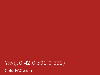 Yxy 10.42,0.591,0.332 Color is a normal red color and the nearest color is Firebrick #b22222. Hex code #af2320 and RGB value is rgb(175,35,32). In RGB color space, this color is composed of 69% red, 14% green, 13% blue, In CMYK color space, this color is composed of 0% cyan, 80% magenta, 82% yellow , 31% black , In HSL color space, this color has a hue angle of 1° , 69% saturation and 41% lightness.