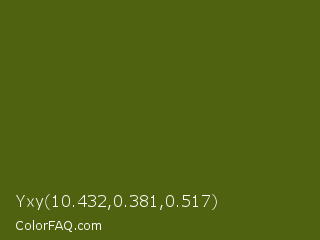 Yxy 10.432,0.381,0.517 Color is a very dark lime color and the nearest color is Saratoga #555b10. Hex code #4f620f and RGB value is rgb(79,98,15). In RGB color space, this color is composed of 31% red, 38% green, 6% blue, In CMYK color space, this color is composed of 19% cyan, 0% magenta, 85% yellow , 62% black , In HSL color space, this color has a hue angle of 74° , 73% saturation and 22% lightness.
