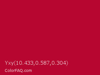 Yxy 10.433,0.587,0.304 Color is a normal red color and the nearest color is Shiraz #b20931. Hex code #b70730 and RGB value is rgb(183,7,48). In RGB color space, this color is composed of 72% red, 3% green, 19% blue, In CMYK color space, this color is composed of 0% cyan, 96% magenta, 74% yellow , 28% black , In HSL color space, this color has a hue angle of 346° , 93% saturation and 37% lightness.