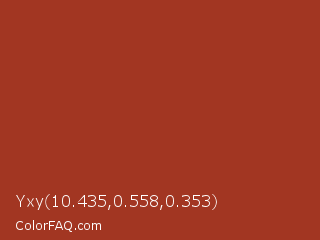Yxy 10.435,0.558,0.353 Color is a normal red color and the nearest color is Cognac #9f381d. Hex code #a23622 and RGB value is rgb(162,54,34). In RGB color space, this color is composed of 64% red, 21% green, 13% blue, In CMYK color space, this color is composed of 0% cyan, 67% magenta, 79% yellow , 36% black , In HSL color space, this color has a hue angle of 9° , 65% saturation and 38% lightness.