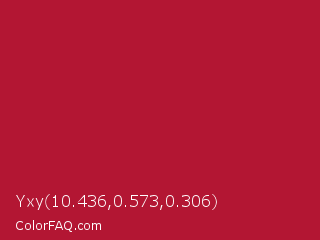 Yxy 10.436,0.573,0.306 Color is a normal red color and the nearest color is Shiraz #b20931. Hex code #b31633 and RGB value is rgb(179,22,51). In RGB color space, this color is composed of 70% red, 9% green, 20% blue, In CMYK color space, this color is composed of 0% cyan, 88% magenta, 72% yellow , 30% black , In HSL color space, this color has a hue angle of 349° , 78% saturation and 39% lightness.