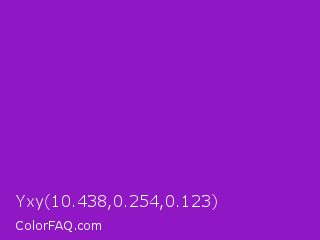 Yxy 10.438,0.254,0.123 Color is a normal purple color and the nearest color is French Violet #8806ce. Hex code #8f18c4 and RGB value is rgb(143,24,196). In RGB color space, this color is composed of 56% red, 9% green, 77% blue, In CMYK color space, this color is composed of 27% cyan, 88% magenta, 0% yellow , 23% black , In HSL color space, this color has a hue angle of 282° , 78% saturation and 43% lightness.