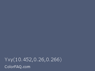 Yxy 10.452,0.26,0.266 Color is a normal blue color and the nearest color is Black Coral #54626f. Hex code #4f5b76 and RGB value is rgb(79,91,118). In RGB color space, this color is composed of 31% red, 36% green, 46% blue, In CMYK color space, this color is composed of 33% cyan, 23% magenta, 0% yellow , 54% black , In HSL color space, this color has a hue angle of 222° , 20% saturation and 39% lightness.