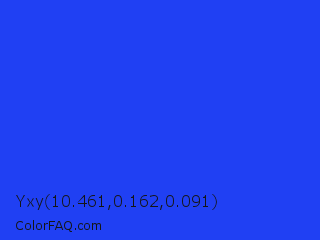 Yxy 10.461,0.162,0.091 Color is a normal blue color and the nearest color is Palatinate Blue #273be2. Hex code #2040f3 and RGB value is rgb(32,64,243). In RGB color space, this color is composed of 13% red, 25% green, 95% blue, In CMYK color space, this color is composed of 87% cyan, 74% magenta, 0% yellow , 5% black , In HSL color space, this color has a hue angle of 231° , 90% saturation and 54% lightness.