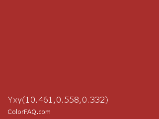 Yxy 10.461,0.558,0.332 Color is a normal red color and the nearest color is Red Brown #a52a2a. Hex code #a82e2c and RGB value is rgb(168,46,44). In RGB color space, this color is composed of 66% red, 18% green, 17% blue, In CMYK color space, this color is composed of 0% cyan, 73% magenta, 74% yellow , 34% black , In HSL color space, this color has a hue angle of 1° , 58% saturation and 42% lightness.