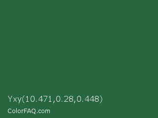 Yxy 10.471,0.28,0.448 Color is a dark green color and the nearest color is Green Pea #1d6142. Hex code #26673f and RGB value is rgb(38,103,63). In RGB color space, this color is composed of 15% red, 40% green, 25% blue, In CMYK color space, this color is composed of 63% cyan, 0% magenta, 39% yellow , 60% black , In HSL color space, this color has a hue angle of 143° , 46% saturation and 28% lightness.