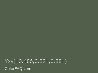 Yxy 10.486,0.321,0.381 Color is a normal green color and the nearest color is Ebony #555d50. Hex code #525f4b and RGB value is rgb(82,95,75). In RGB color space, this color is composed of 32% red, 37% green, 29% blue, In CMYK color space, this color is composed of 14% cyan, 0% magenta, 21% yellow , 63% black , In HSL color space, this color has a hue angle of 99° , 12% saturation and 33% lightness.