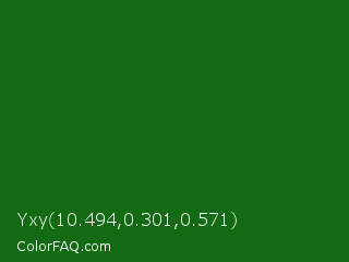 Yxy 10.494,0.301,0.571 Color is a dark green color and the nearest color is Japanese Laurel #0a6906. Hex code #126a13 and RGB value is rgb(18,106,19). In RGB color space, this color is composed of 7% red, 42% green, 7% blue, In CMYK color space, this color is composed of 83% cyan, 0% magenta, 82% yellow , 58% black , In HSL color space, this color has a hue angle of 121° , 71% saturation and 24% lightness.