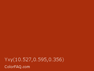 Yxy 10.527,0.595,0.356 Color is a normal red color and the nearest color is Tabasco #a02712. Hex code #aa2e0c and RGB value is rgb(170,46,12). In RGB color space, this color is composed of 67% red, 18% green, 5% blue, In CMYK color space, this color is composed of 0% cyan, 73% magenta, 93% yellow , 33% black , In HSL color space, this color has a hue angle of 13° , 87% saturation and 36% lightness.