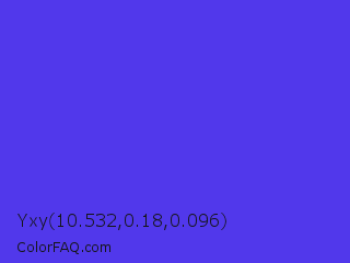 Yxy 10.532,0.18,0.096 Color is a normal indigo color and the nearest color is Majorelle Blue #6050dc. Hex code #5138eb and RGB value is rgb(81,56,235). In RGB color space, this color is composed of 32% red, 22% green, 92% blue, In CMYK color space, this color is composed of 66% cyan, 76% magenta, 0% yellow , 8% black , In HSL color space, this color has a hue angle of 248° , 82% saturation and 57% lightness.