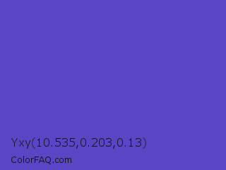 Yxy 10.535,0.203,0.13 Color is a normal indigo color and the nearest color is Iris #5a4fcf. Hex code #5a46c5 and RGB value is rgb(90,70,197). In RGB color space, this color is composed of 35% red, 27% green, 77% blue, In CMYK color space, this color is composed of 54% cyan, 64% magenta, 0% yellow , 23% black , In HSL color space, this color has a hue angle of 249° , 52% saturation and 52% lightness.