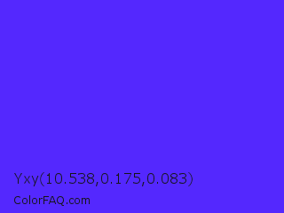 Yxy 10.538,0.175,0.083 Color is a normal indigo color and the nearest color is Han Purple #5218fa. Hex code #5428fe and RGB value is rgb(84,40,254). In RGB color space, this color is composed of 33% red, 16% green, 100% blue, In CMYK color space, this color is composed of 67% cyan, 84% magenta, 0% yellow , 0% black , In HSL color space, this color has a hue angle of 252° , 99% saturation and 58% lightness.