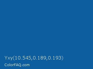 Yxy 10.545,0.189,0.193 Color is a normal blue color and the nearest color is Bahama Blue #026395. Hex code #0d5e9e and RGB value is rgb(13,94,158). In RGB color space, this color is composed of 5% red, 37% green, 62% blue, In CMYK color space, this color is composed of 92% cyan, 41% magenta, 0% yellow , 38% black , In HSL color space, this color has a hue angle of 206° , 85% saturation and 34% lightness.