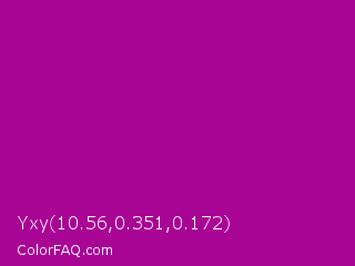 Yxy 10.56,0.351,0.172 Color is a normal magenta color and the nearest color is Violet Eggplant #991199. Hex code #a80595 and RGB value is rgb(168,5,149). In RGB color space, this color is composed of 66% red, 2% green, 58% blue, In CMYK color space, this color is composed of 0% cyan, 97% magenta, 11% yellow , 34% black , In HSL color space, this color has a hue angle of 307° , 94% saturation and 34% lightness.