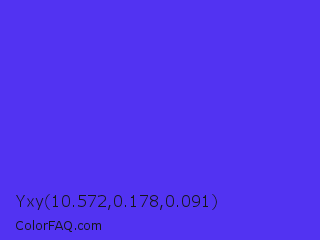 Yxy 10.572,0.178,0.091 Color is a normal indigo color and the nearest color is Han Purple #5218fa. Hex code #5233f2 and RGB value is rgb(82,51,242). In RGB color space, this color is composed of 32% red, 20% green, 95% blue, In CMYK color space, this color is composed of 66% cyan, 79% magenta, 0% yellow , 5% black , In HSL color space, this color has a hue angle of 250° , 88% saturation and 57% lightness.