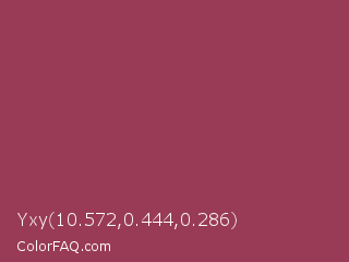 Yxy 10.572,0.444,0.286 Color is a normal rose color and the nearest color is Vin Rouge #983d61. Hex code #993b56 and RGB value is rgb(153,59,86). In RGB color space, this color is composed of 60% red, 23% green, 34% blue, In CMYK color space, this color is composed of 0% cyan, 61% magenta, 44% yellow , 40% black , In HSL color space, this color has a hue angle of 343° , 44% saturation and 42% lightness.