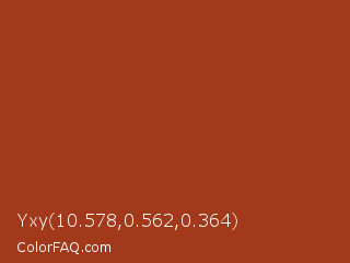 Yxy 10.578,0.562,0.364 Color is a normal red color and the nearest color is Cognac #9f381d. Hex code #a1391a and RGB value is rgb(161,57,26). In RGB color space, this color is composed of 63% red, 22% green, 10% blue, In CMYK color space, this color is composed of 0% cyan, 65% magenta, 84% yellow , 37% black , In HSL color space, this color has a hue angle of 14° , 72% saturation and 37% lightness.