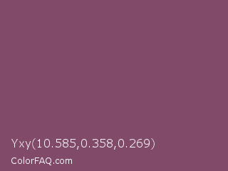 Yxy 10.585,0.358,0.269 Color is a normal magenta color and the nearest color is Twilight Lavender #8a496b. Hex code #814a69 and RGB value is rgb(129,74,105). In RGB color space, this color is composed of 51% red, 29% green, 41% blue, In CMYK color space, this color is composed of 0% cyan, 43% magenta, 19% yellow , 49% black , In HSL color space, this color has a hue angle of 326° , 27% saturation and 40% lightness.