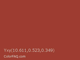 Yxy 10.611,0.523,0.349 Color is a normal red color and the nearest color is Stiletto #9c3336. Hex code #9c3d2f and RGB value is rgb(156,61,47). In RGB color space, this color is composed of 61% red, 24% green, 18% blue, In CMYK color space, this color is composed of 0% cyan, 61% magenta, 70% yellow , 39% black , In HSL color space, this color has a hue angle of 8° , 54% saturation and 40% lightness.
